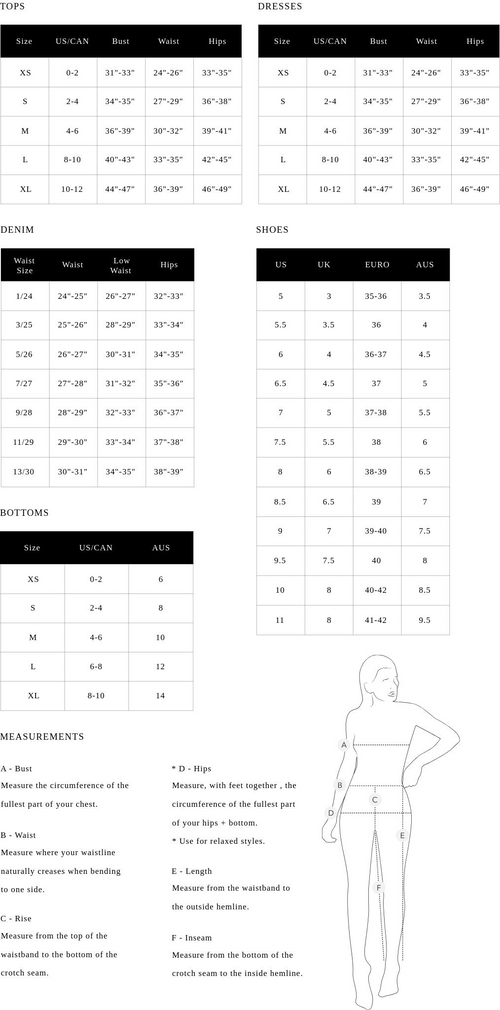 Our size guide to discover your perfect fit across our styles—think of it as your personal fitting room guide to ensure your ensemble is tailored to your silhouette. Each piece in our curated collection boasts its unique character, which means the fit might vary just as beautifully as the styles themselves.